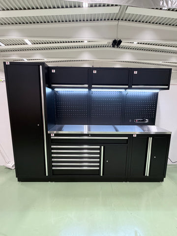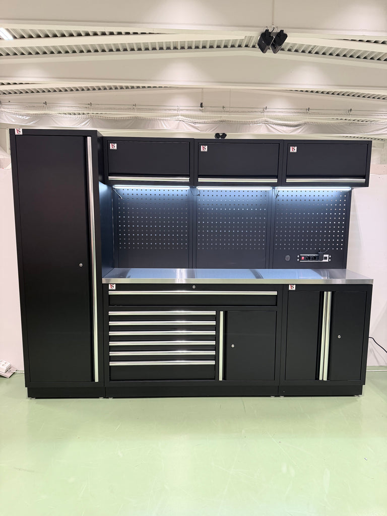 Garasje og verksted innredning inkludert stikkontakt med USB utganger, 3 stk LED lys samt låsbare skap og skuffer. Justerbare ben er inkludert.