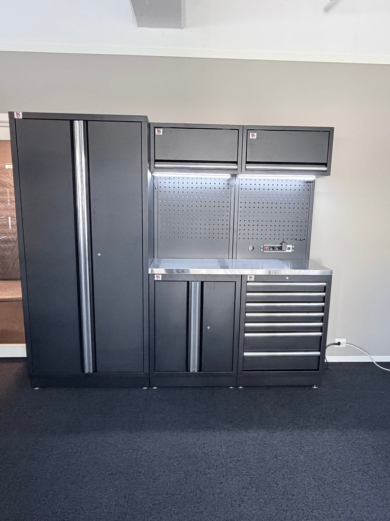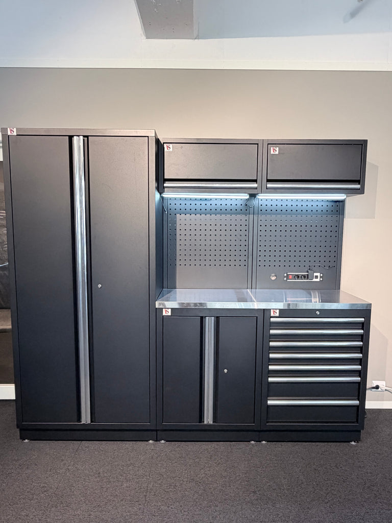 Garasje og verksted innredning inkludert stikkontakt med USB utganger, 2 stk LED lys samt låsbare skap og skuffer. Justerbare ben er inkludert.