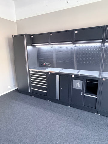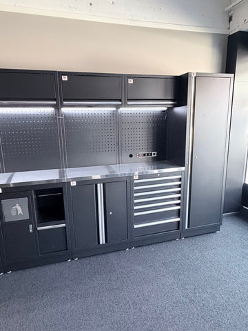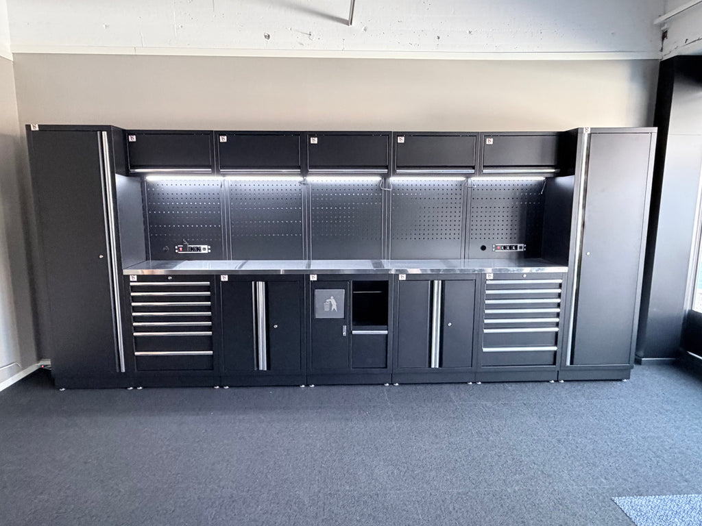 Garasje og verksted innredning inkludert 2 x stikkontakt med USB utganger, 4 stk LED lys samt låsbare skap og skuffer. Justerbare ben er inkludert.