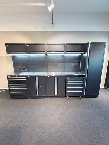 Garasje og verksted innredning inkludert stikkontakt med USB utganger, 3 stk LED lys samt låsbare skap og skuffer. Justerbare ben er inkludert.